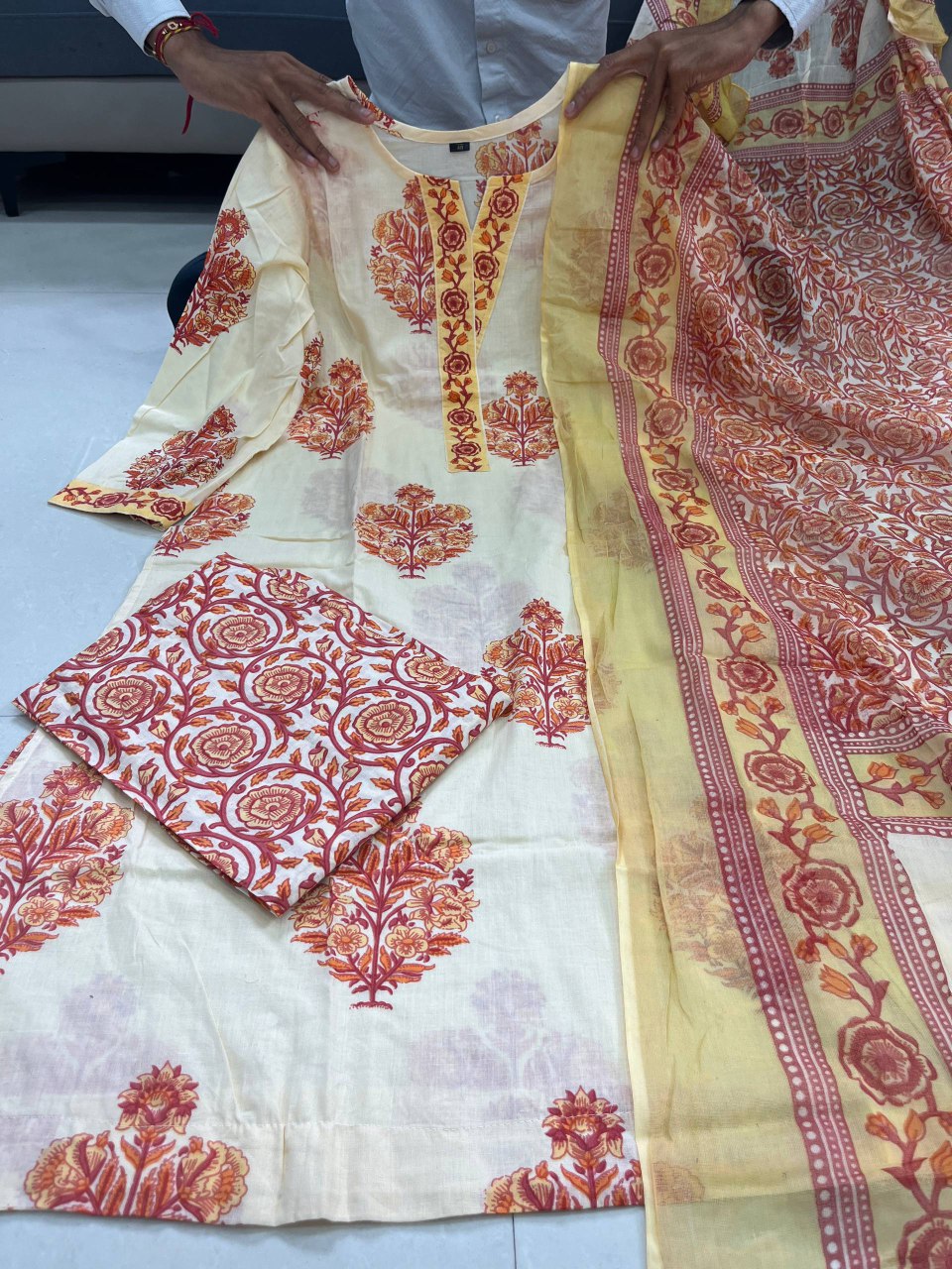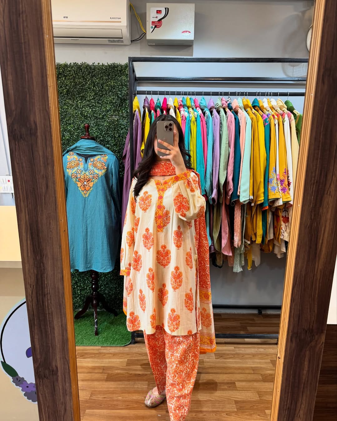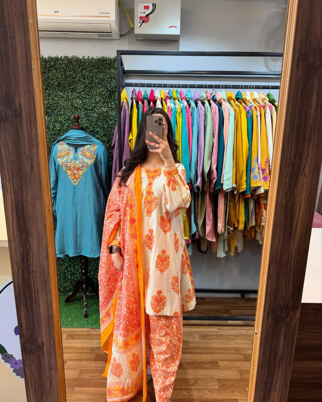 Orange soft mul cotton kurta and pant set with printed work dupatta
