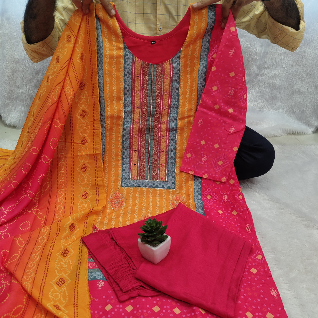 Pink and orange muslin silk kurta and pent set with bandhani printed dupatta