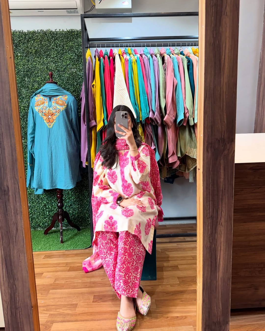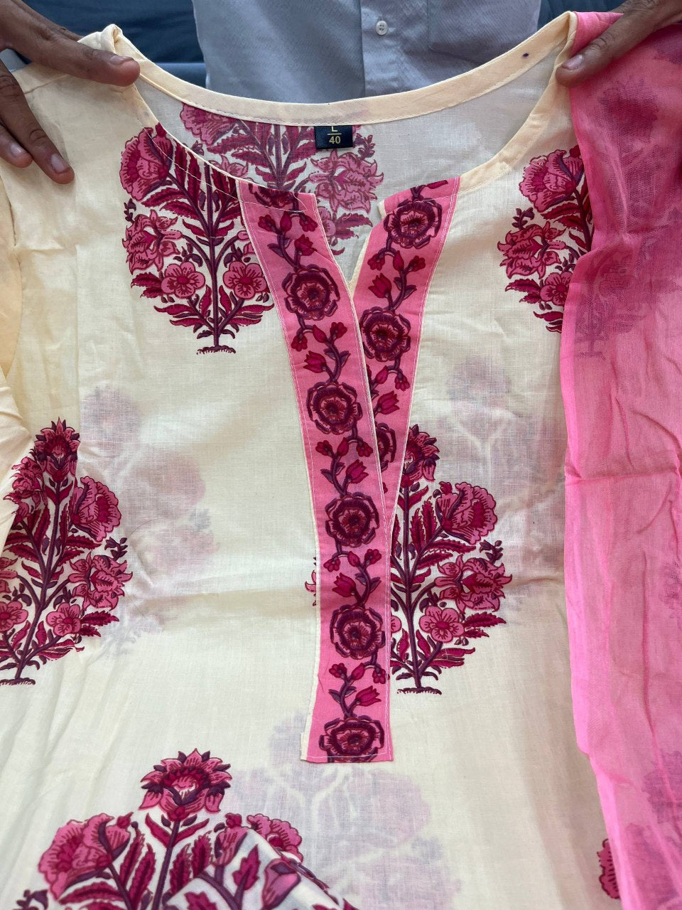 Pink soft mul cotton kurta and pant set with printed work dupatta