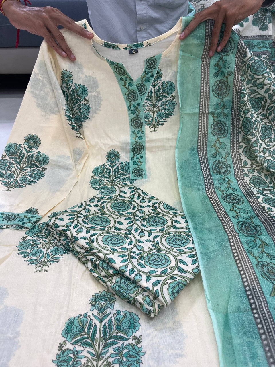 Sea green soft mul cotton kurta and pant set with printed work dupatta